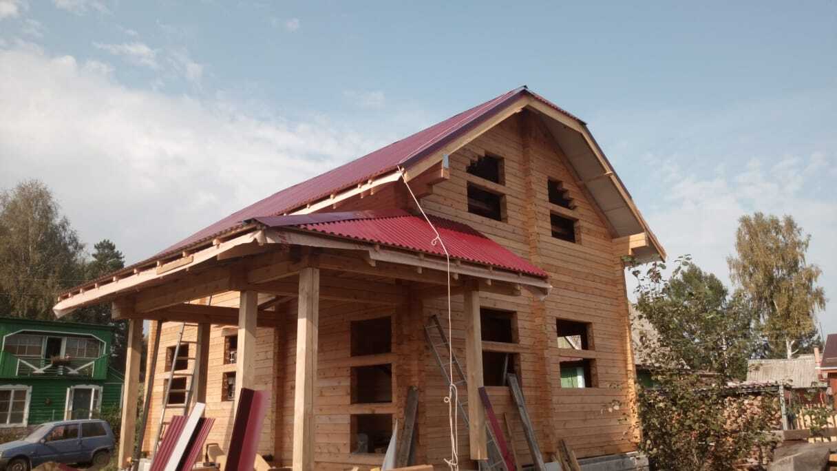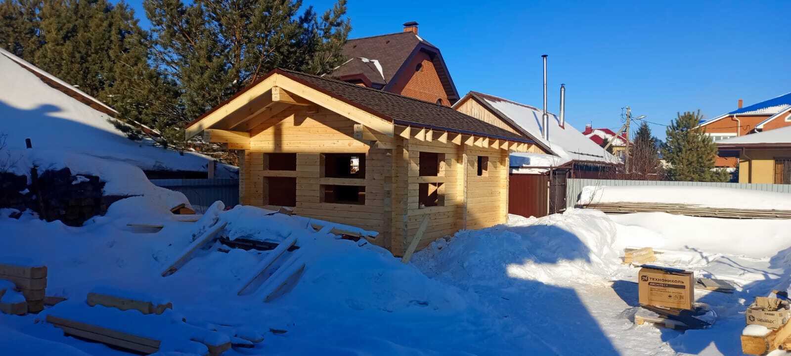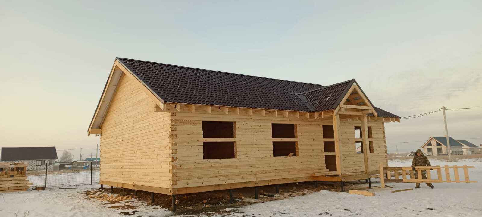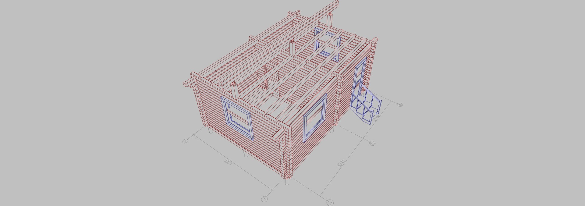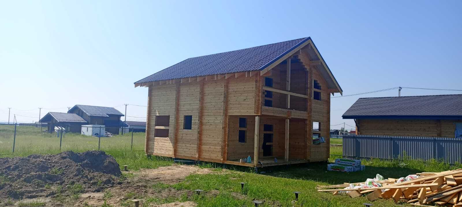 Стоимость в комплектации «под усадку»: обвязка, лаги пола, балки потолка, стропила, обрешётка, металлочерепица, крепёж, сборка.