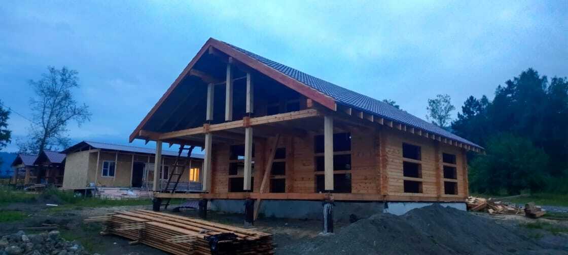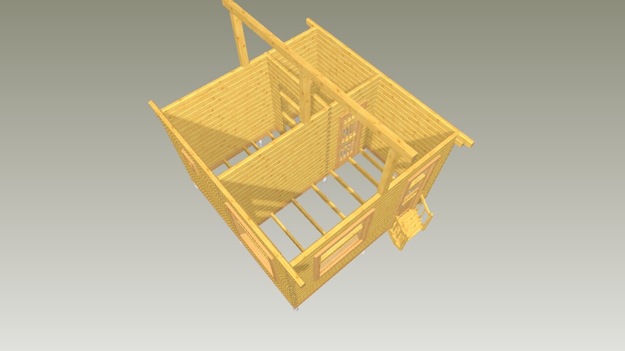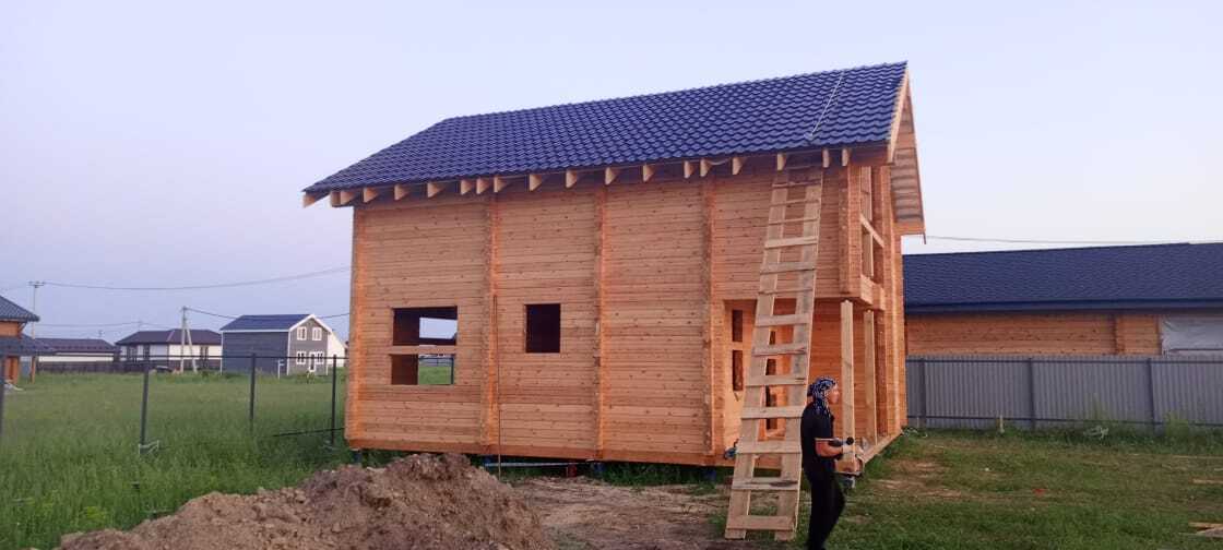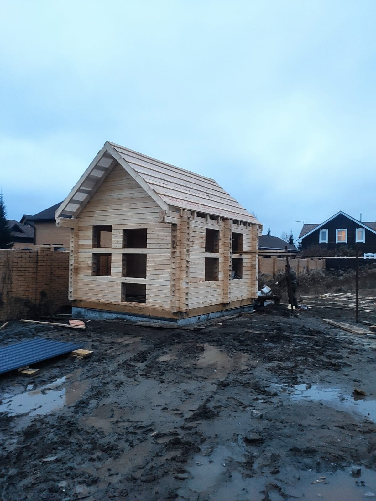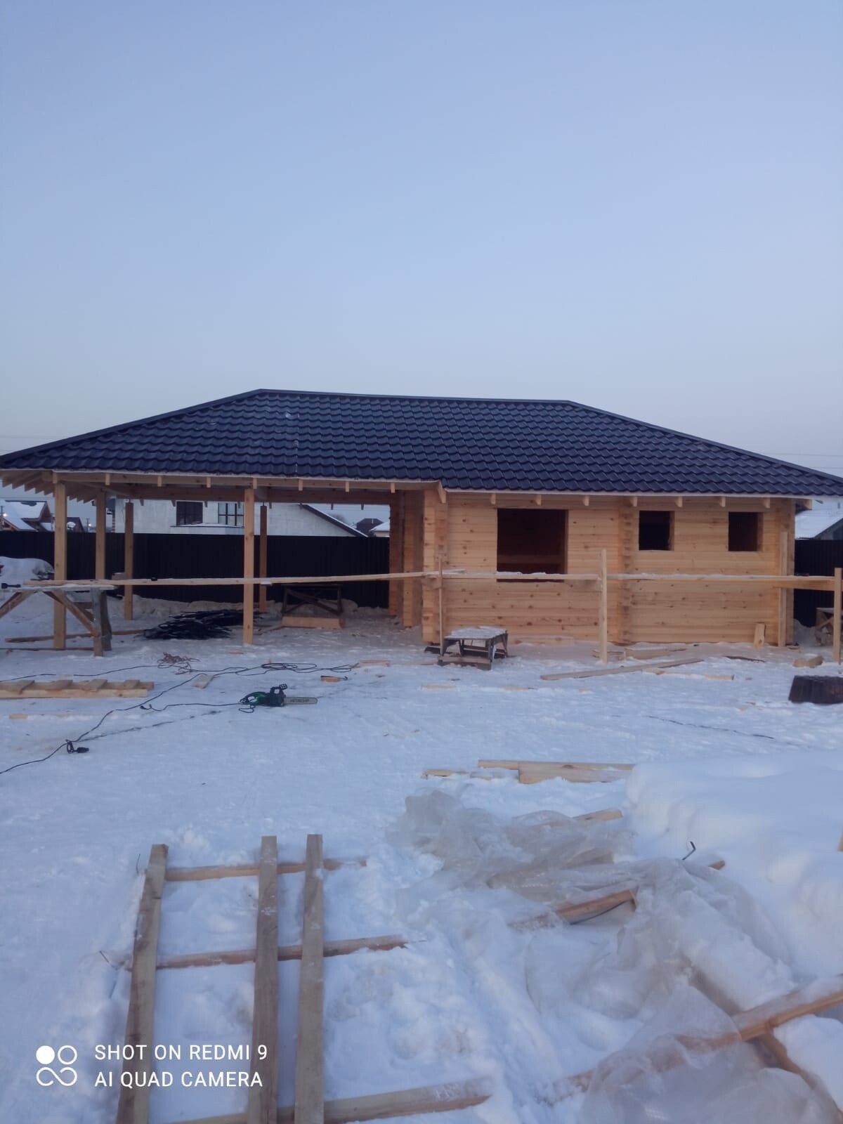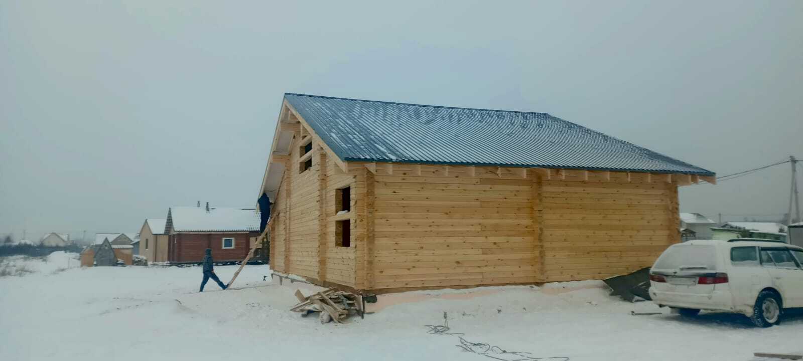 Стоимость в комплектации «под усадку»: обвязка, лаги пола, балки потолка, стропила, обрешётка, металлочерепица, крепёж, сборка- рассчитывается индивидуально